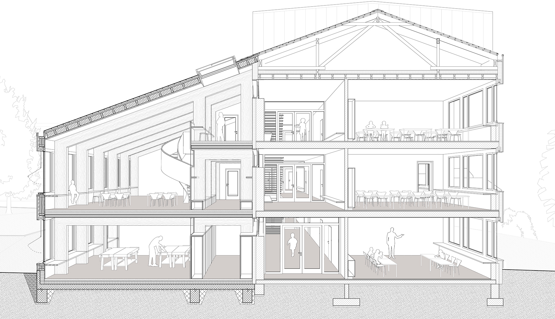 Die schmalere Raumschicht nimmt Erschliessung, Neben- und Infrastrukturräume auf, die tiefere Schicht Unterrichts-, Betreuungs- und Lehrerbereiche. Zweigeschossige Aufenthaltszonen mit Galerie bieten vielfältige Nutzungen. Das bestehende Achsmass von 2.69 Metern wird übernommen und ermöglicht flexible Grundrisse. Ziel war es, Eingriffe und Kosten im Bestand gering zu halten.