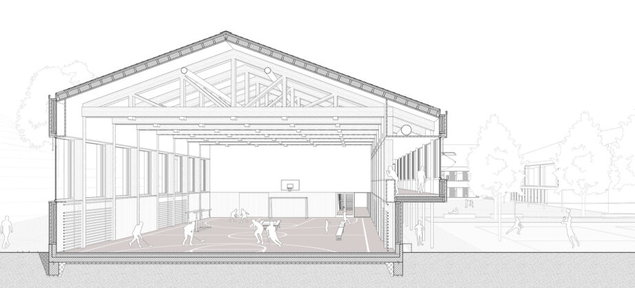 Die Turnhalle gliedert sich in den Hallenkörper und einen dreigeschossigen Nebenraumtrakt mit Foyer, Garderoben und Technik. Der Hallenbereich wird in Holzelementbauweise, der Garderobentrakt in Massivbau ausgeführt.