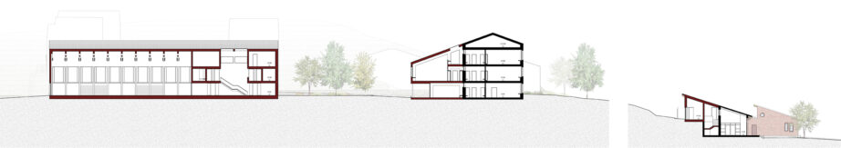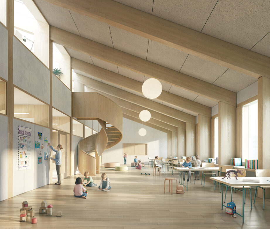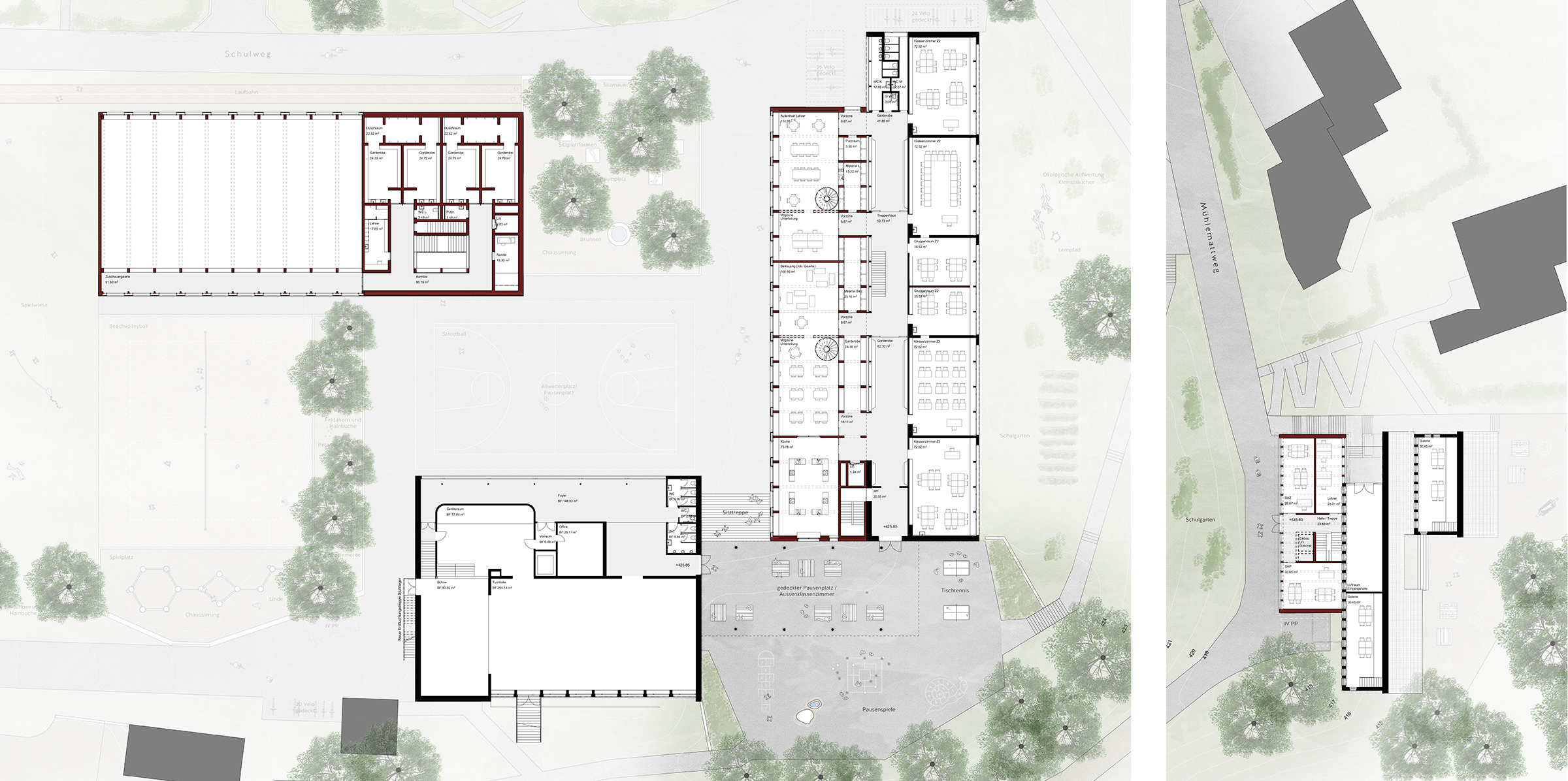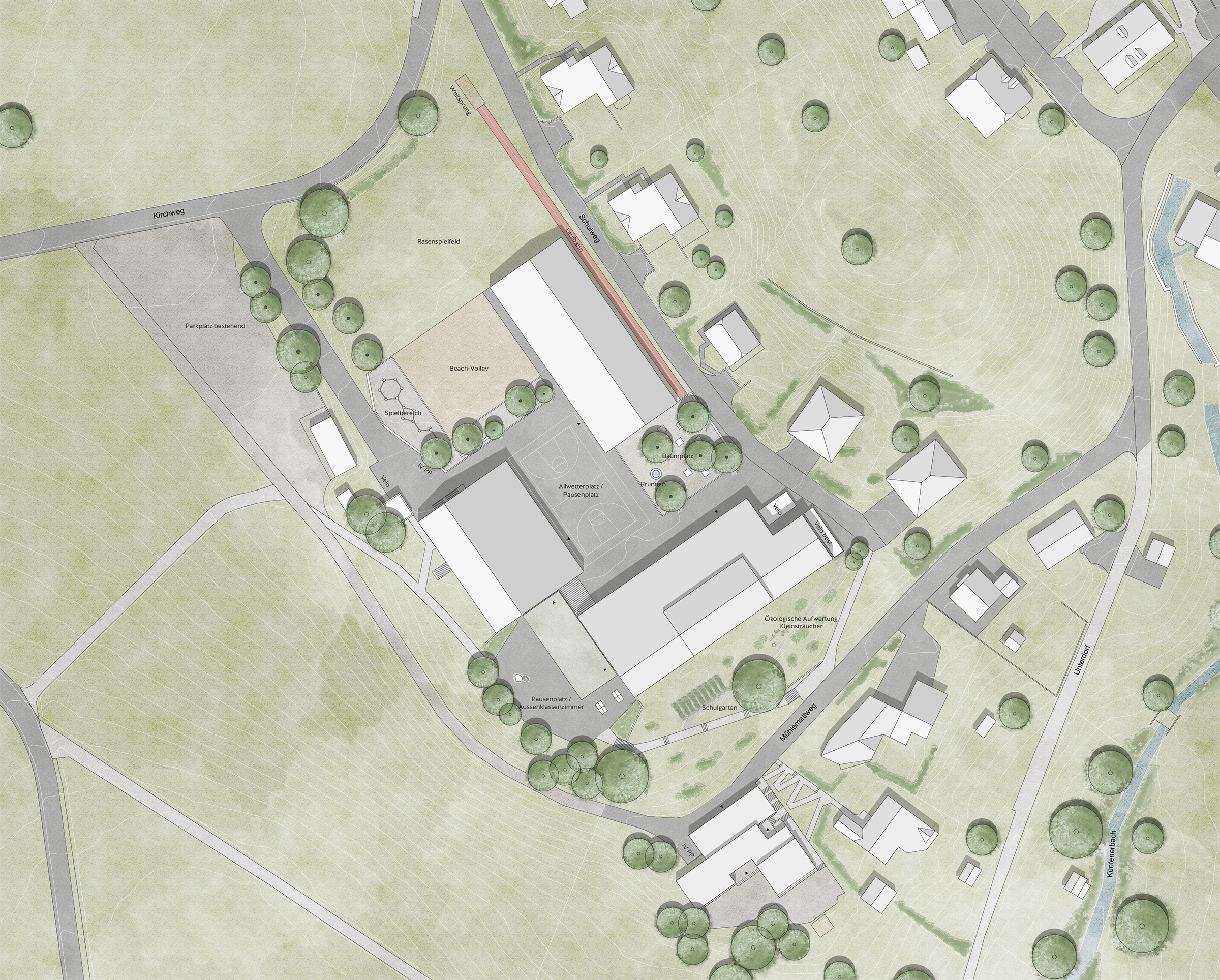 Die Gebäude bilden eine Abfolge differenzierter Aussenräume: Zugangsplatz am Schulweg, zentraler Pausenhof, Beachvolleyballfelder mit beschattetem Spielbereich und abschliessende Spielwiese. Die neue Turnhalle definiert als schlanker Baukörper den Rücken des Areals. Ihre Dachneigung übernimmt jene des Bestands. Mit einer einheitlichen Traufhöhe von rund 6.5 Metern entsteht eine kindgerechte Massstäblichkeit. Der Kindergarten erhält eine zusätzliche Raumschicht mit weitergeführter Dachform.