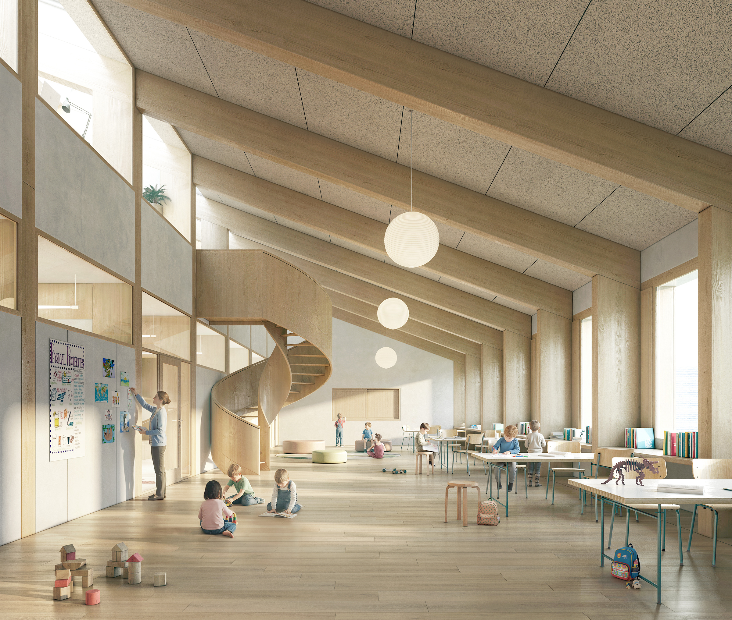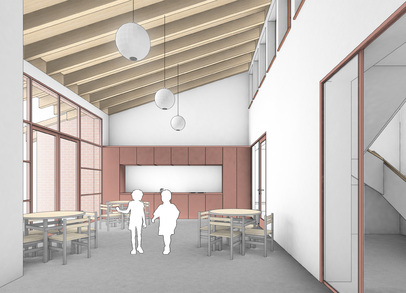Der neue Anbau entlang des Mühlemattwegs schafft Räume für Lehrpersonen, SHP und DaZ. Eine neue Treppe im Bereich der heutigen Küche und ein optionaler Lift ermöglichen neu eine Erschliessung auf dem Niveau Mühlemattwegs. Die Gemeinschaftsküche wird in die grosszügige Eingangshalle verlagert. Die ungenutzte Galerie wird im Bereich der Eingangshalle entfernt, wodurch die Grosszügigkeit des Raumes erlebbar wird. Durch ein alles Aus Schalter kann verhindert werden, dass die Küche von den Kindergärtner unbeaufsichtigt betätigt werden kann.