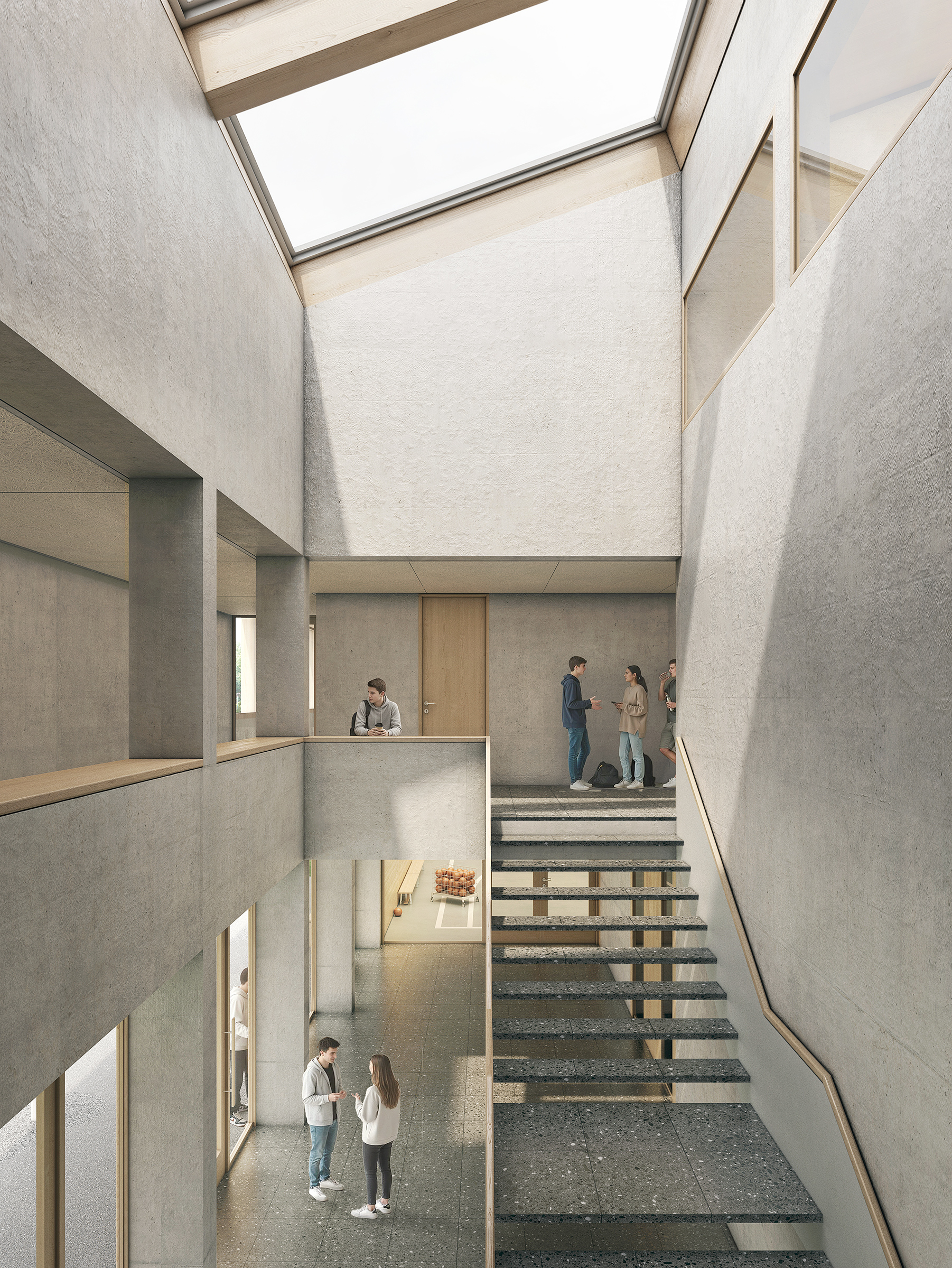 Das Foyer ist zentral am Pausenhof angeordnet und gewährleistet kurze Wege zwischen allen Gebäuden. Eine Galerie mit Auskragung schafft Einblicke in die Halle sowie gedeckte Aufenthaltsbereiche im Aussenraum. Die ebenerdige Lage der Halle ermöglicht direkte Zugänge; auf ein Untergeschoss wird aus ökologischen und wirtschaftlichen Gründen verzichtet.