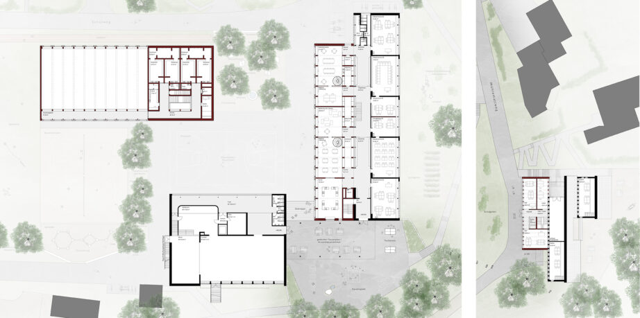 Durch die Platzierung der neuen Turnhalle entlang des Schulwegs sowie eine zusätzliche Raumschicht an der Nordseite des Schulhauses werden diese Defizite behoben. Es entsteht ein klar gefasstes, stimmiges Ensemble.