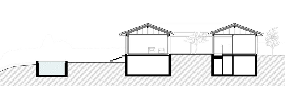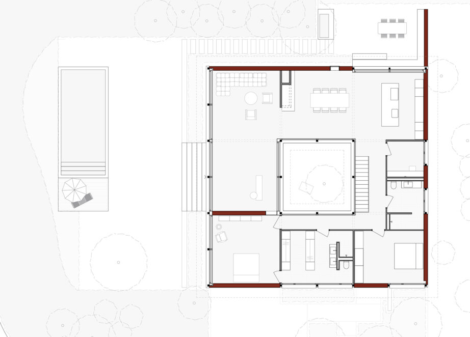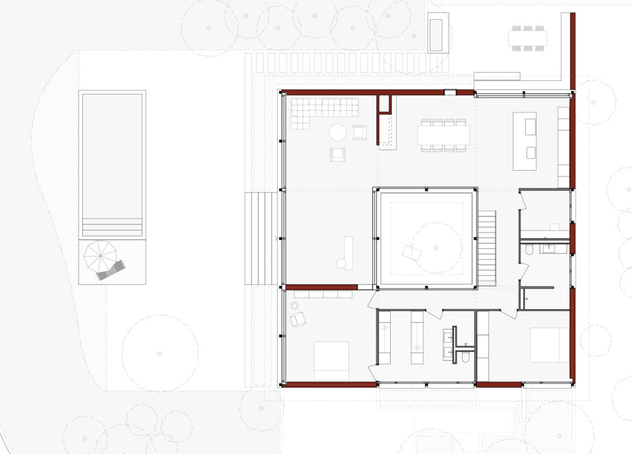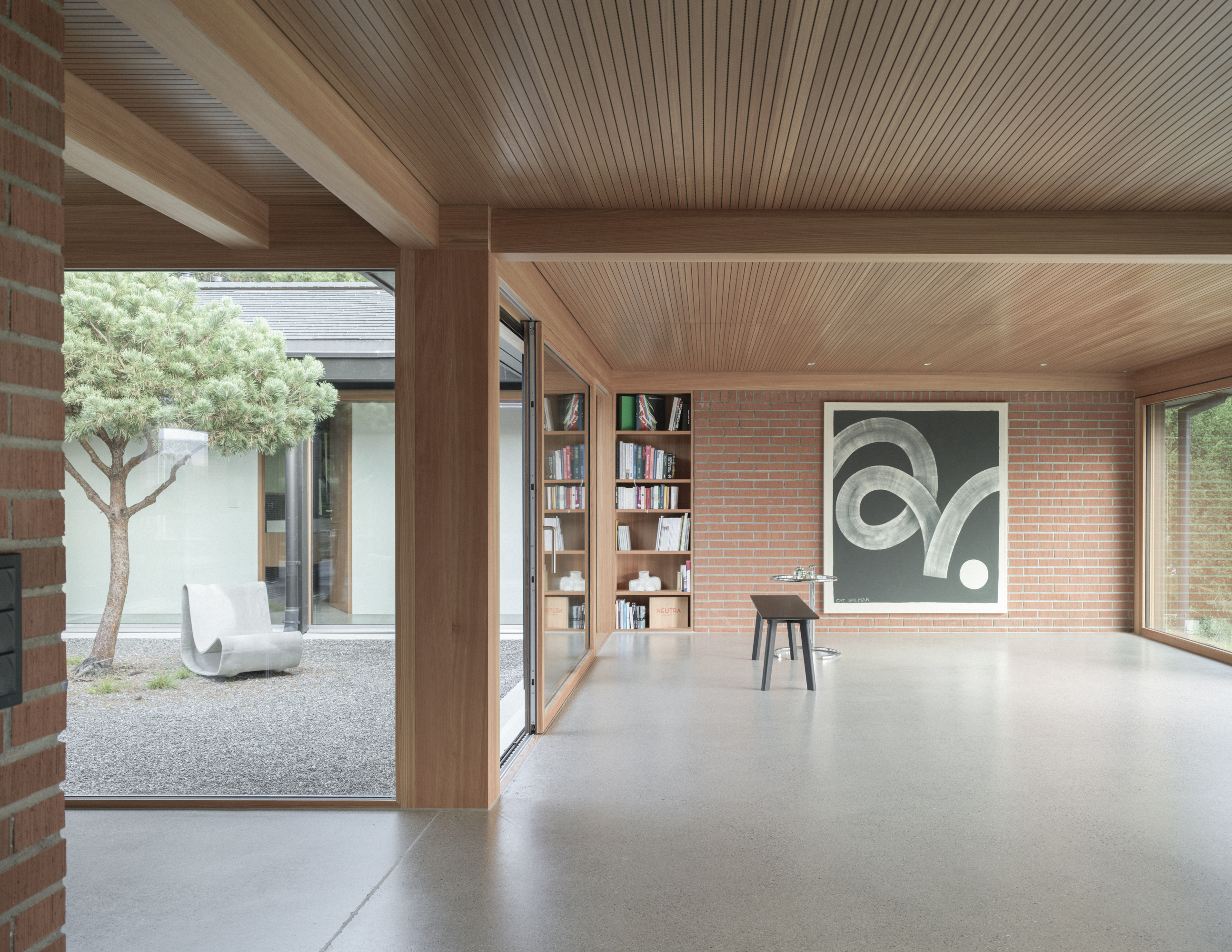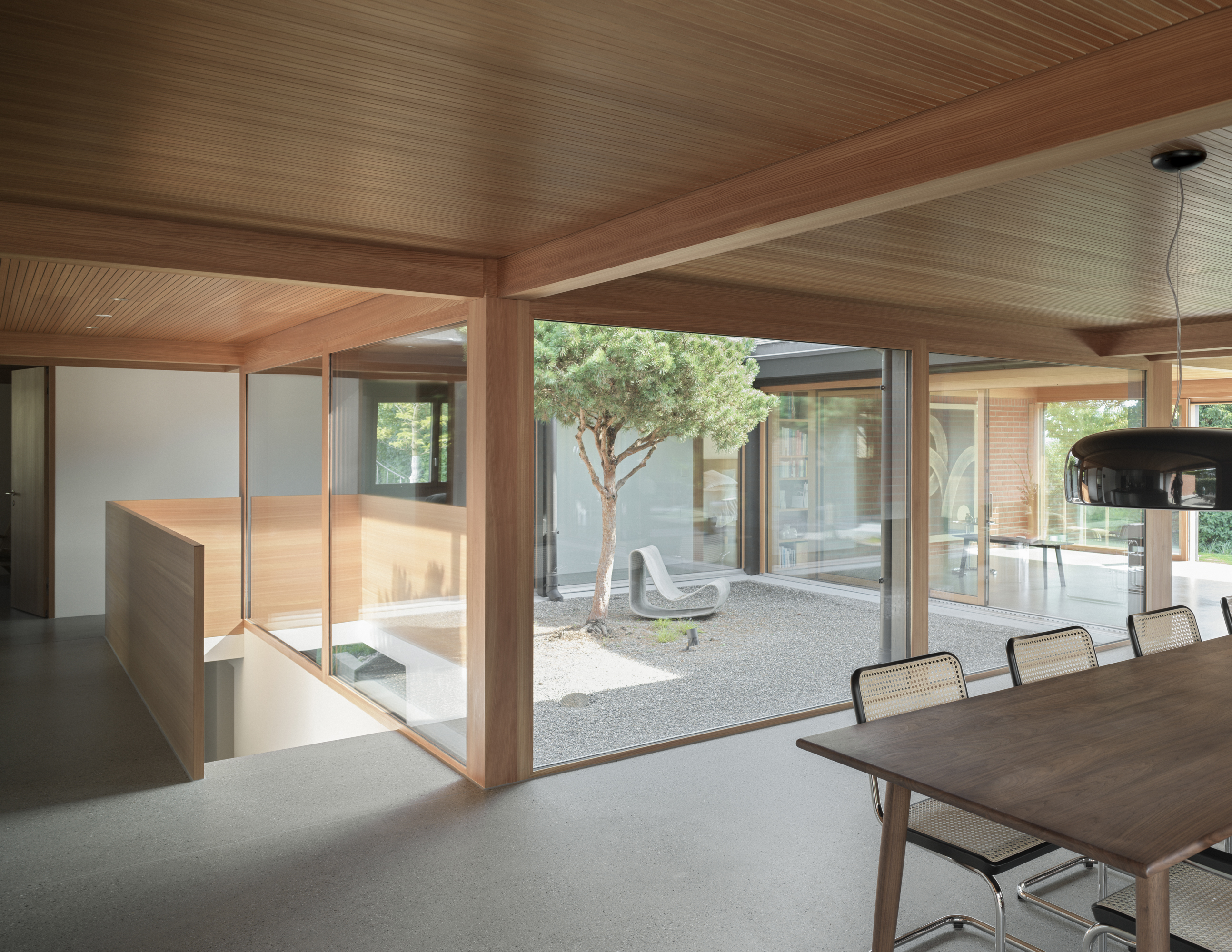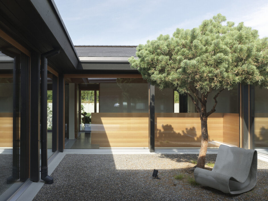 Die Erweiterung der Wohnfläche schliesst den ursprünglich U-förmigen Grundriss zu einer umlaufenden Wohnebene mit Innenhof, gestaltet als Kiesgarten mit Kiefer.
