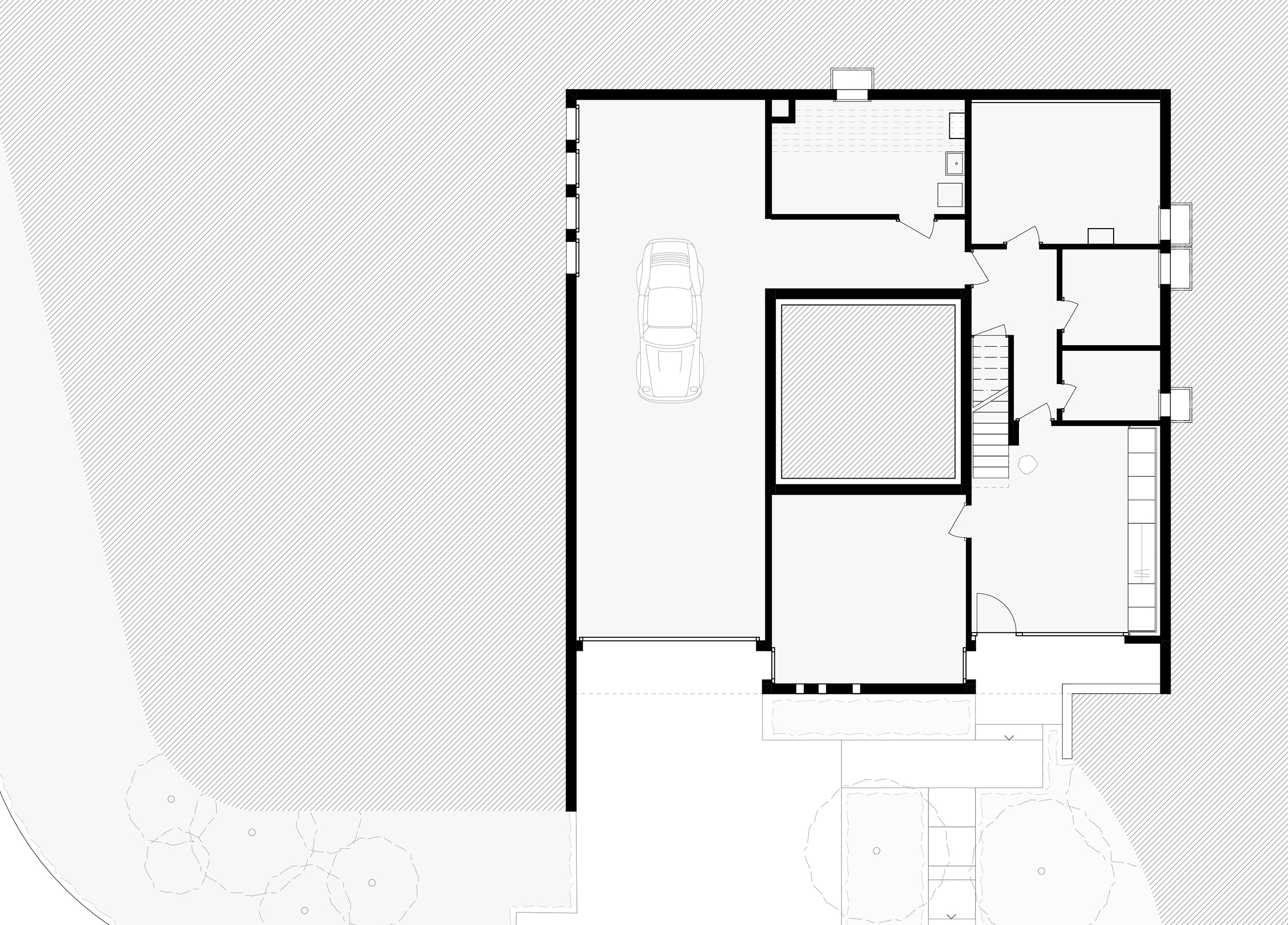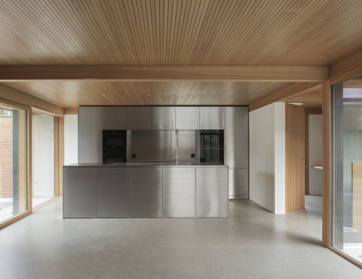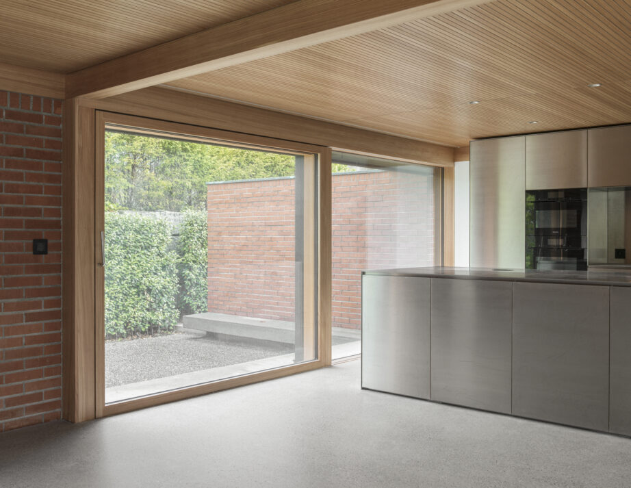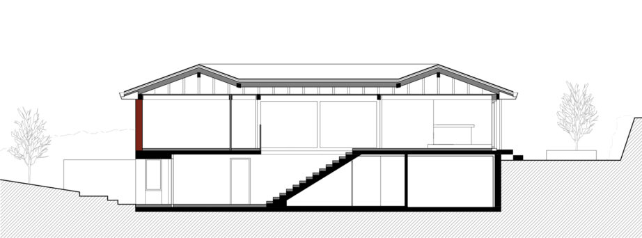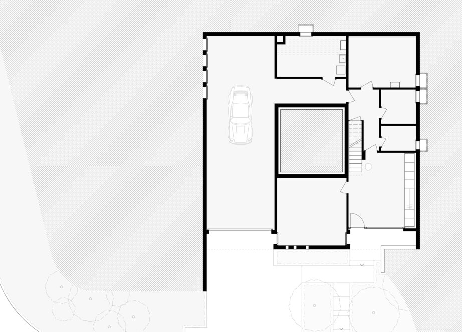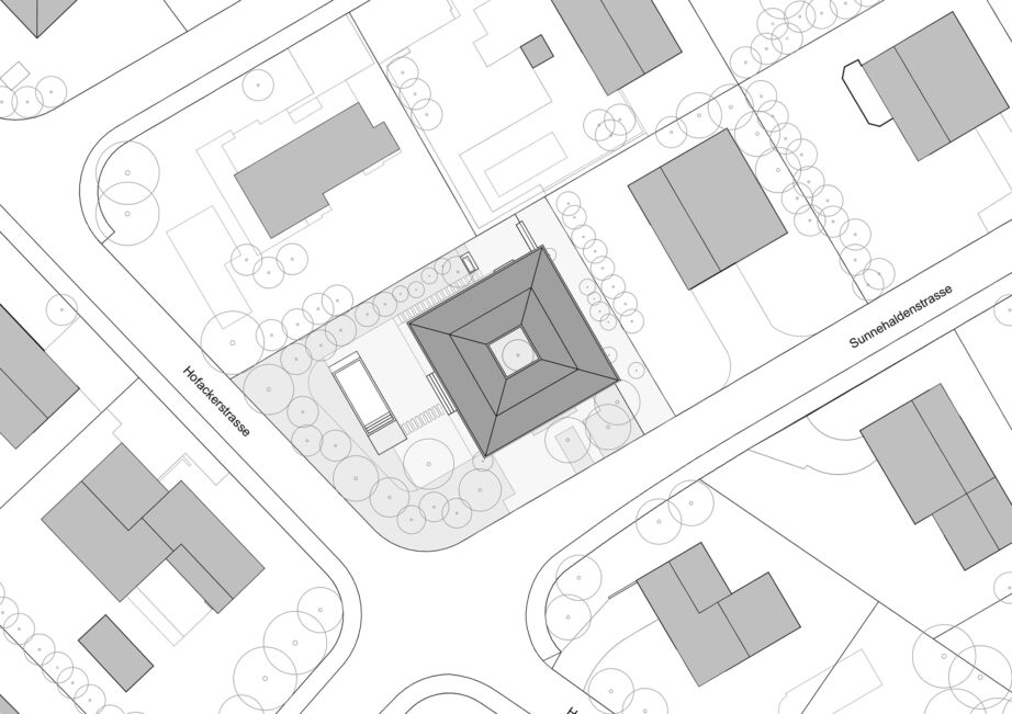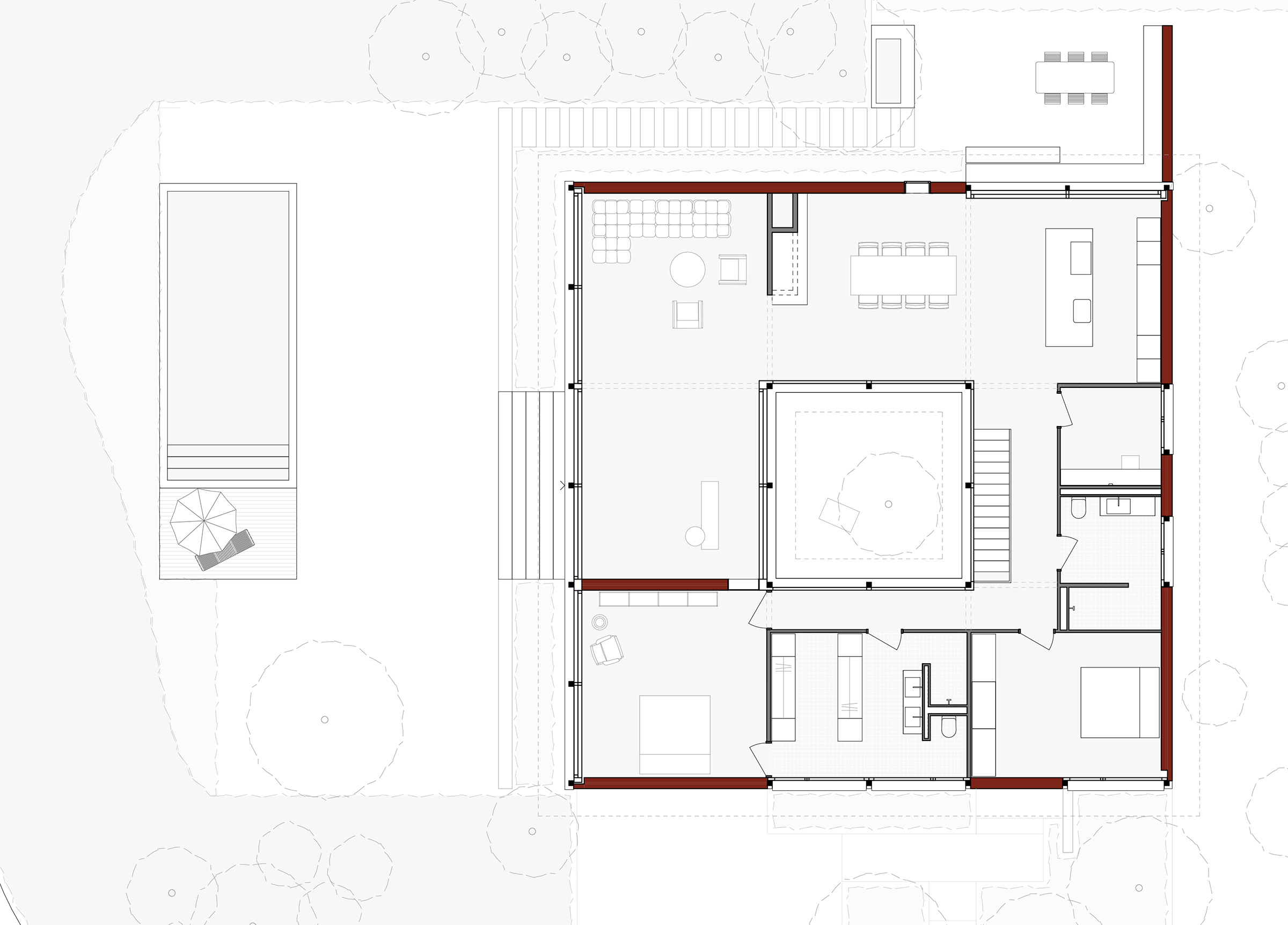 Die Erweiterung der Wohnfläche schliesst den ursprünglich U-förmigen Grundriss zu einer umlaufenden Wohnebene mit Innenhof, gestaltet als Kiesgarten mit Kiefer.
